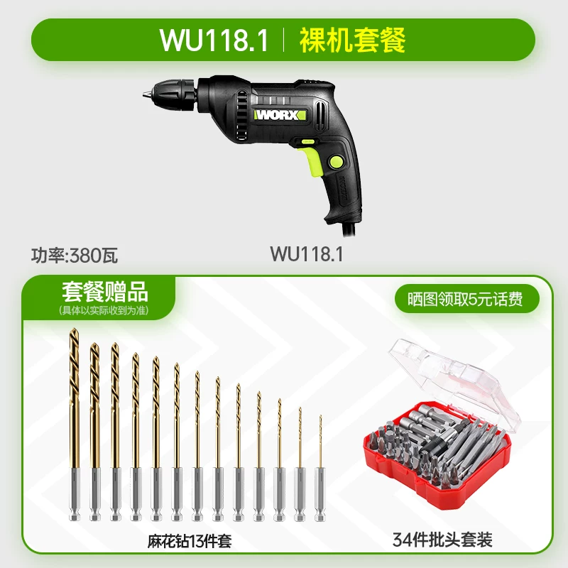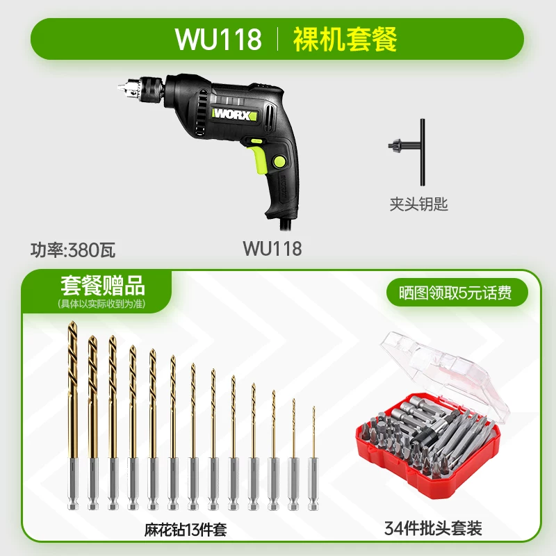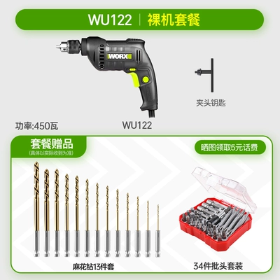 Phân loại màu: WE101 kim loại trần (410 watt). Gói sang trọng wu118 (máy khoan cầm tay 10 mm 380 watt). Gói sang trọng wu118.1 (máy khoan cầm tay 10 mm 380 watt (mâm cặp không chìa)). WU122 [450 watt 1,3 kg Tay cầm 10 mm -mâm cặp chặt]. WU122K [mâm cặp tự siết 10 mm 450W 1,3kg]. Gói sang trọng wu107 (đầu B máy khoan cầm tay 650W 13 mm).