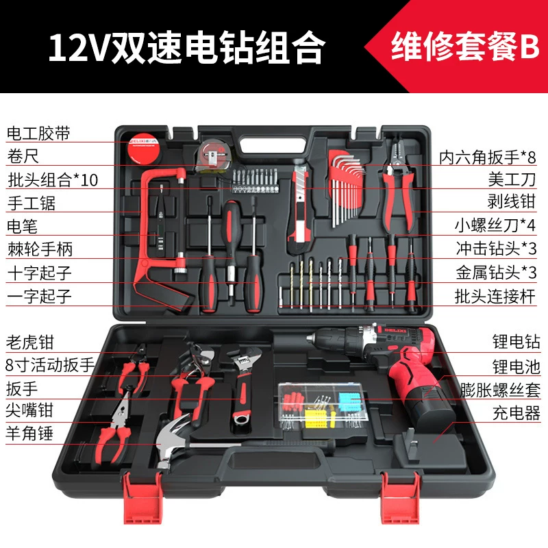 Bộ dụng cụ máy khoan điện lithium gia dụng Delixi phần cứng thợ điện chế biến gỗ bảo trì đặc biệt Hộp dụng cụ đa chức năng Daquan máy khoan betong bosch Máy khoan đa năng