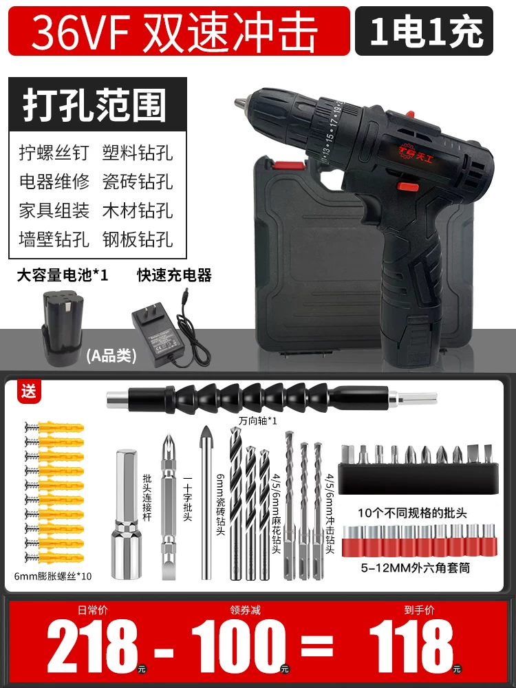 Máy khoan điện cầm tay Tiangong sang máy vặn vít có thể sạc lại súng lục máy khoan pin lithium công cụ điện đa chức năng máy khoan tác động tại nhà mũi khoan bê tông 4 cạnh Mũi khoan