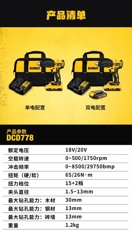 Máy khoan lithium không chổi than DeWalt Máy khoan cầm tay có thể sạc lại đa chức năng Máy khoan tác động Công cụ điện nhỏ Máy khoan súng lục DCD778D2 khoan bê tông Máy khoan đa năng